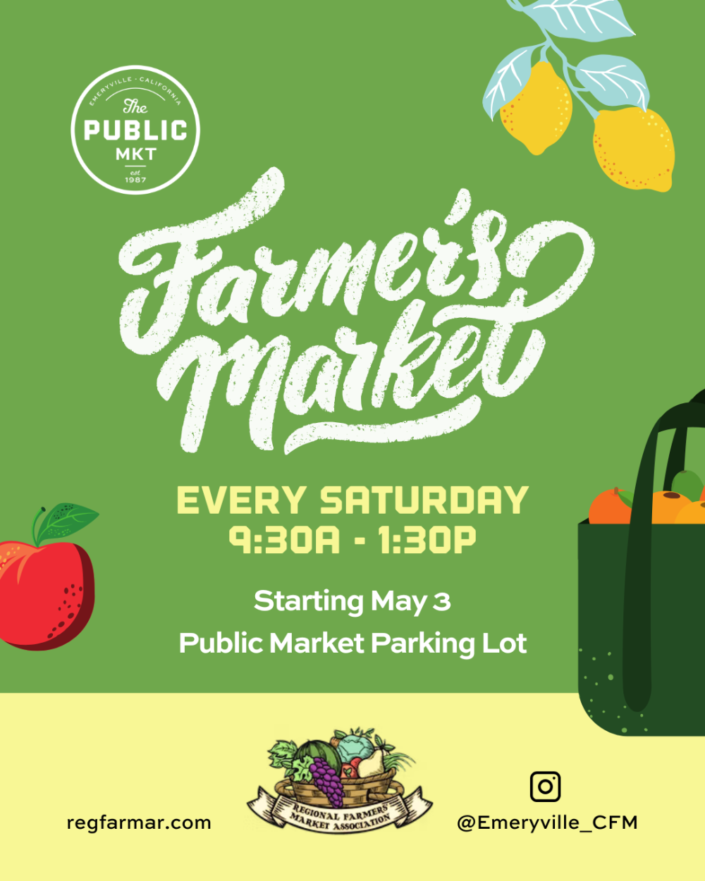 The Farmer’s Market is back! Each Saturday from 9:30A – 1:30P, 25-30 vendors will bring California grown fruits and vegetables as well as local packaged food producers to Public Market. Come visit and support small and local businesses at the Public Market Parking Lot!